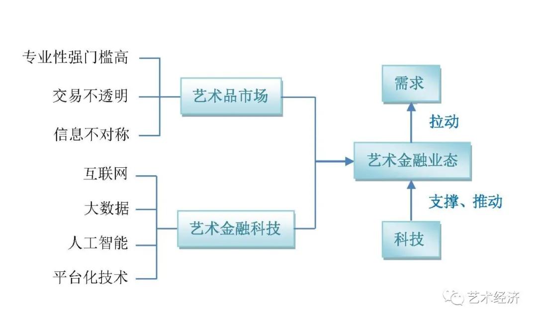 在研究探索艺术金融创新的过程中,我们必须明确一个基本的前提,那就是艺术品市场与艺术品产业的发展孕育了艺术金融,而科技融合建构了新的基础设施,催生了金融科技进步,金融科技的发展又推动了艺术金融新业态的发展,这是一个基本的发展逻辑。