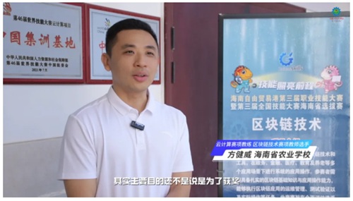 海南省农业学校计算机通信专业的教师方健威将参加区块链技术的比赛,具有丰富比赛经验的他同时还是云计算项目的教练。一边“教”一边“学”的“双重”身份让方老师忙碌又充实,他每天和学生同吃同住,白天作为选手参加训练,晚上为参赛学生答疑解惑。